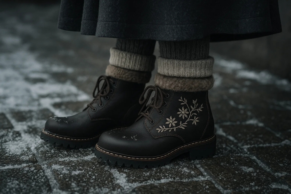 Kaltes Wetter erfordert praktisches Schuhwerk – doch das heißt nicht, dass du auf Stil verzichten musst. Knöchelhohe Stiefel, Lederslipper oder gefütterte Schnürschuhe sind hervorragende Optionen für dein Winter-Dirndl. Verzichte bei Schnee oder Nässe unbedingt auf offene Schuhe oder Ballerinas.