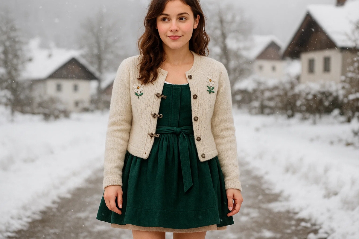 Am besten eignen sich klassische, taillenkurze Woll-Strickjacken (Strickjacke) oder traditionelle Alpenjacken (Janker). Diese Modelle sind so geschnitten, dass sie auf Taillenhöhe enden und so die Silhouette des Dirndls erhalten. Für Outdoor-Veranstaltungen wähle am besten gewalkte Wolle oder gefütterte Varianten mit dekorativen Knöpfen – so bleibst du warm und stilvoll im bayerischen Look.