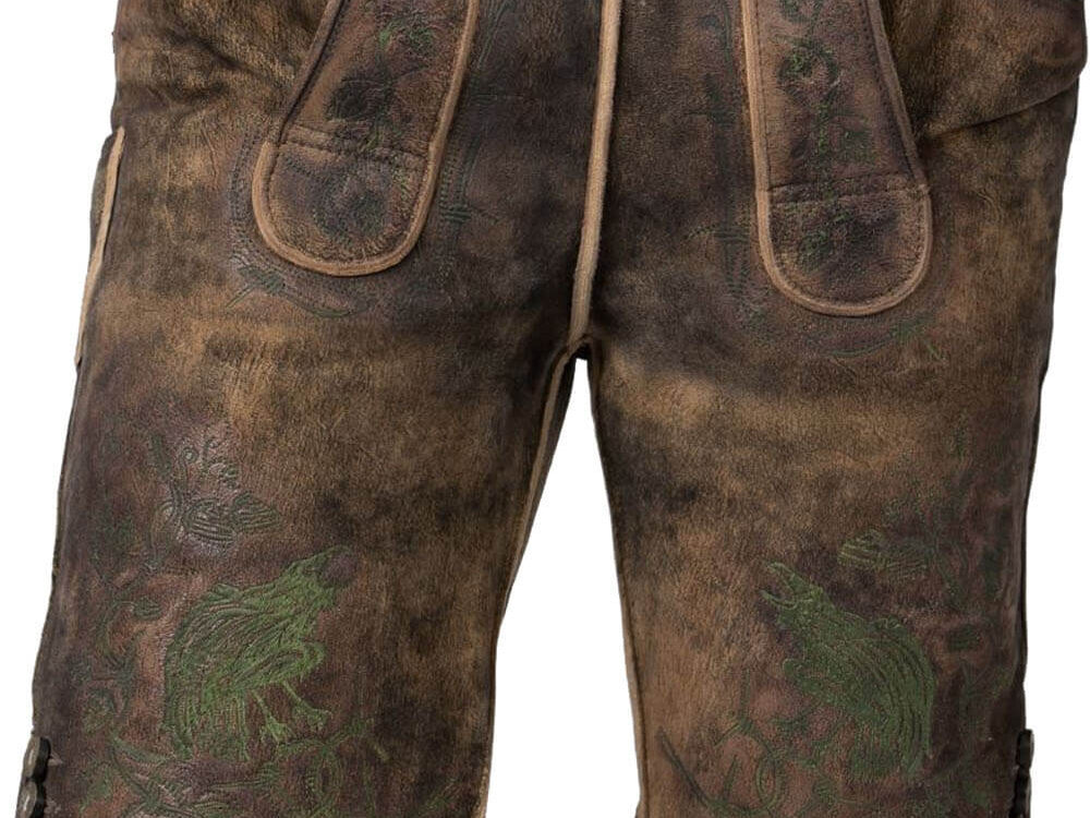 Vintage Walnussbraune Lederhose mit waldgrüner Stickerei